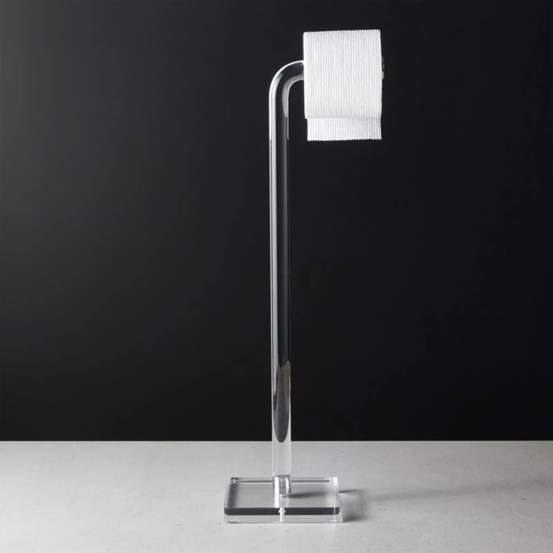 Acrylic and polished nickel toilet paper holder freestands a single roll in modern style. Round acrylic bar curves as it rises to nickel end cap. CB2 exclusive.