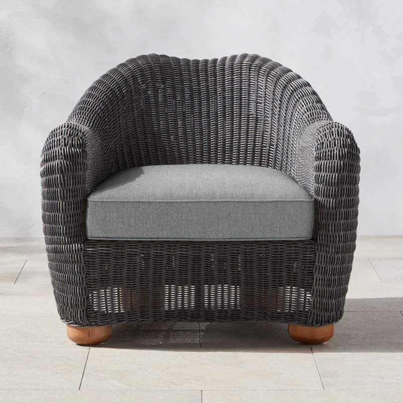 The bestselling Bacio upholstery collection goes outside in one of designer Ross Cassidy’s favorite materials: faux rattan that has all the natural appeal of the real thing, but will stand the test of time. Charcoal grey all-weather lounge chair rests atop rounded feet crafted from eucalyptus and is exceptionally easy to live with, thanks to a pewter grey cushion wrapped in Sunbrella performance fabric. CB2 exclusive.