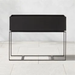Low planter brings sleek geometric design to outdoor settings. Elevated on a rectangular base, steel is powdercoated in matte black, serving as a bold contrast to lush greenery. Great for planting herbs. CB2 exclusive.