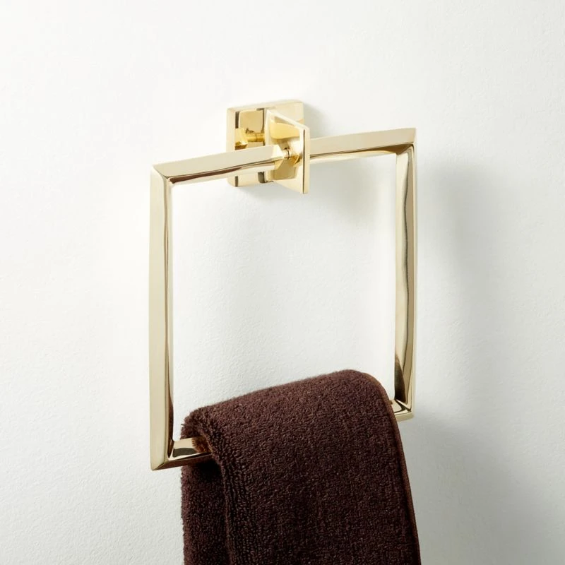 Designed by Barcelona-based Mermelada Estudio, unique beveled towel ring brings sharp lines and a touch of modern luxury to the bath. Solid brass is unlacquered for a living finish that will patina beautifully over time. Bathroom collection also includes wall-mounted hook, towel bar and toilet paper holder. CB2 exclusive.