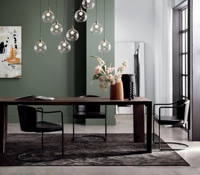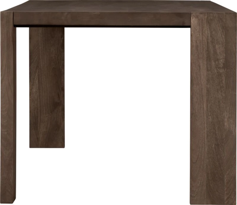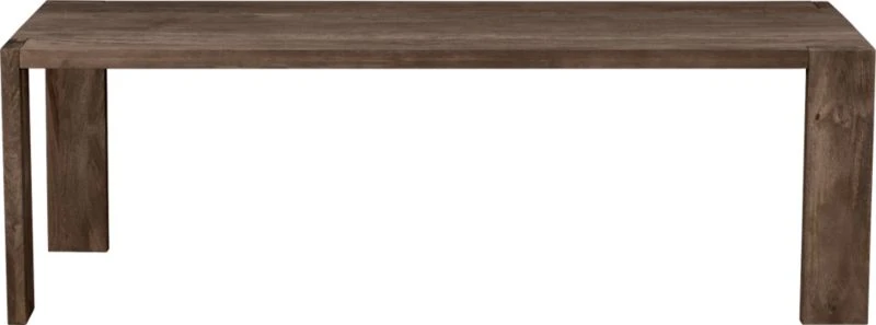 Plantation grown solid mango wood planks shift perspective in asymmetric wide/narrow leg rotation. Bird’s eye view from the top is stunning: sweeping woodgrain in midtone brown, inset legs create directional geometry (and dinner conversation). XL span seats party of ten.