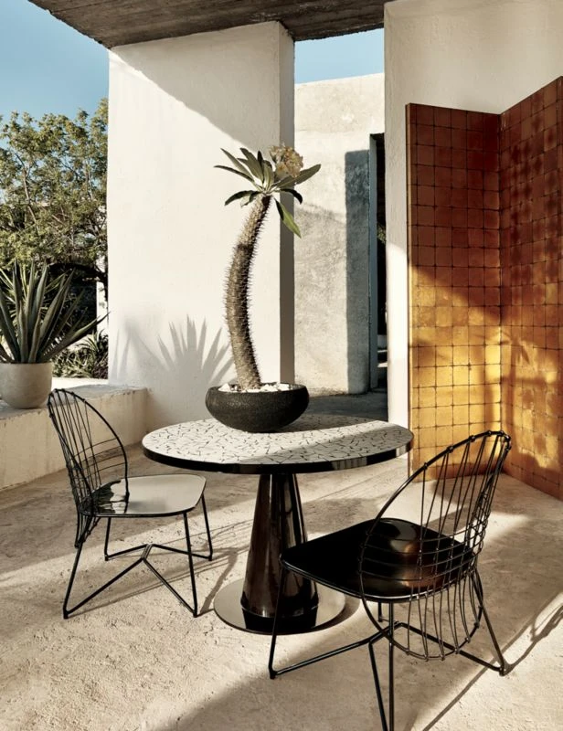 Black resin concrete composite planter surfaces a pebbled texture that looks so at home outdoors. Opens wide for botanicals, doubles as decorative bowl. CB2 exclusive.