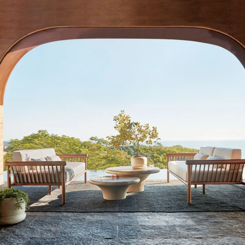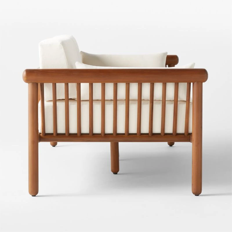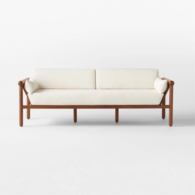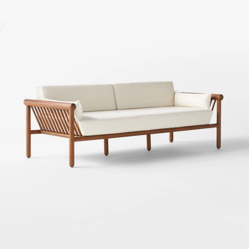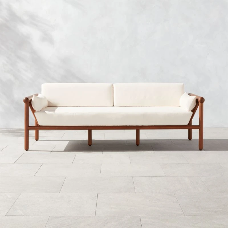 Inspired by Brazilian modernism in silhouette and materiality, outdoor sofa by VUUE brings sophistication to the patio. The frame, made of stained teak certified sustainable by the Forest Stewardship Council ® (FSC), features smooth dowels and domed legs that support tailored cushions and pillows in fade-resistant, low-maintenance ivory Sunbrella ® performance fabric. CB2 exclusive.