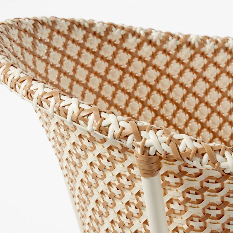 All-weather wicker is handwoven into a modern diamond pattern in elegant natural and white. Designed by Mermelada Estudio to give personality and energy to any space, outdoors or in. Solid aluminum frame is hand-welded into a soft curve that’s both sculptural and comfortable. CB2 exclusive.