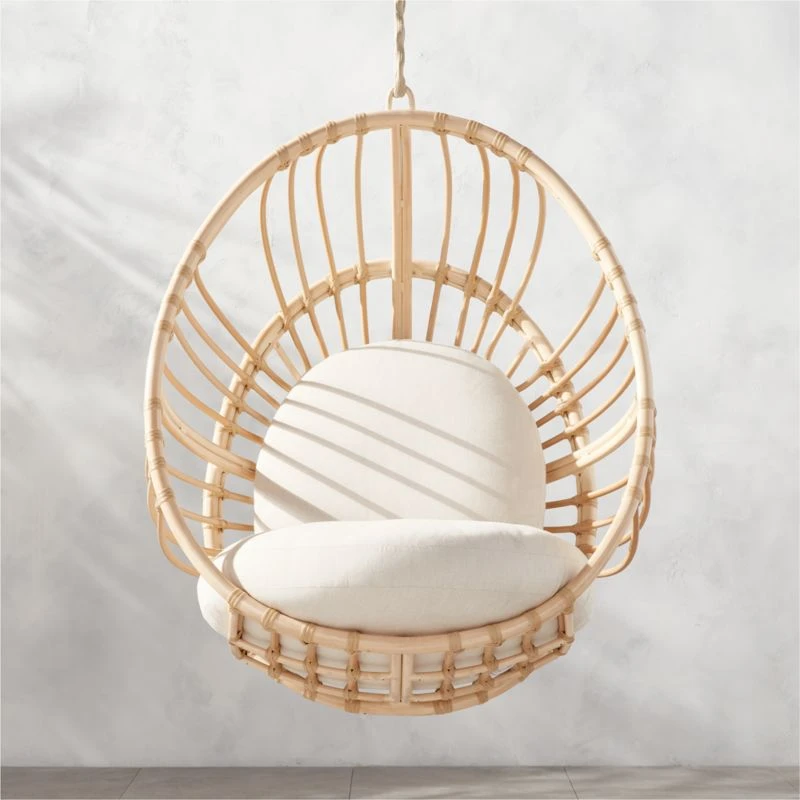 Brazilian design informs the open weave of this resin wicker hanging chair. Designed by Hettler.Tüllmann, this breezy chair hangs beautifully outdoors or indoors. Two plush textured cushions are tucked inside for an ultra comfy seat. Sewn from a Sunbrella ® performance fabric, cushions are durable, comfortable, easy to clean and color-stable. CB2 exclusive.