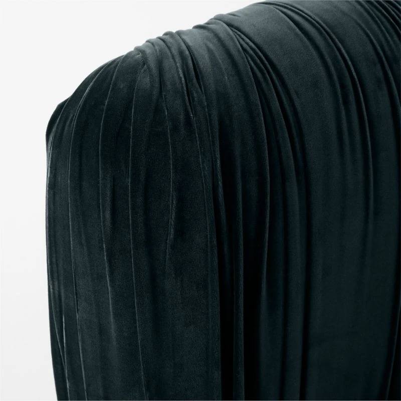 Fully upholstered bed by Jannis Ellenberger brings luxury and drama to the bedroom. Padded headboard, footboard and rails are enveloped in ruched blue velvet; stout cylindrical legs, crafted from oak certified sustainable by the Forest Stewardship Council ® (FSC), keep the look modern. CB2 exclusive.