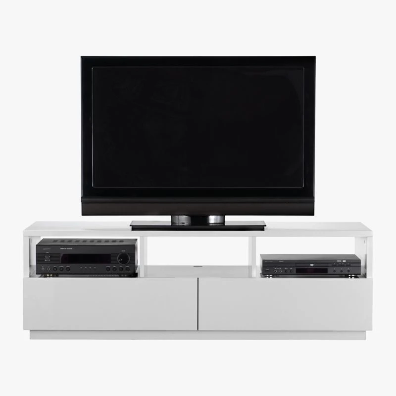 Thoughtful details and workmanship by Eric Pfeiffer at an exceptionally thoughtful CB2 price (of course). Three open component cubbies span over two XL closed drawers angled to open sans pulls on smooth metal glides. Smart details you can’t see here: back is completely finished—all white, all around—so it can float in the room; center media cutouts funnel cords to an integrated ledge along the entire lower back edge then out the bottom to tidy up wires. Engineered wood slicked in hi-gloss lacquer. chill media console is a CB2 exclusive.