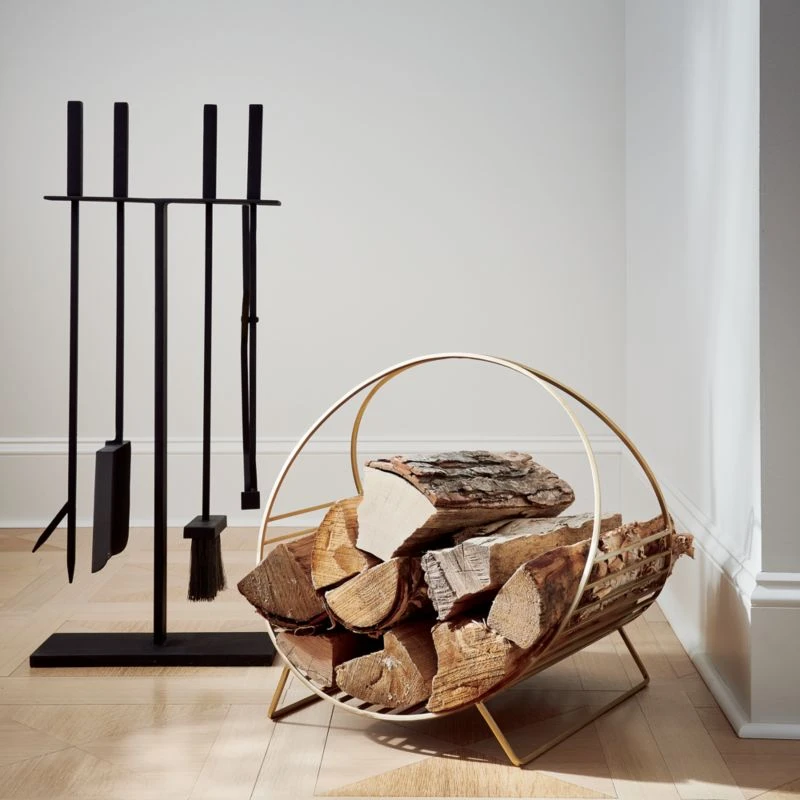 Antique brass-finished log holder adds flare as fireplace sidekick. Vintage styling offers instant warmth with or without a fire. Pairs nicely with our antique brass fireplace screen. CB2 exclusive.