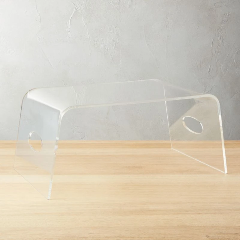 A clear companion for breakfast in bed. Or impromptu work space on the sofa. Sleek, ultra durable curve of thick acrylic tops your lap wherever. Cutout handles make for easy transport of the bed tray. acrylic bed tray is a CB2 exclusive.