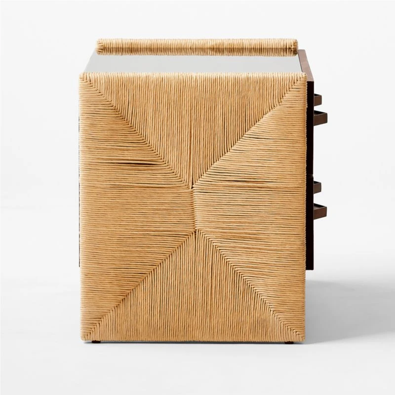 Inspired by Danish midcentury and ’70s modern, Kravitz Design nightstand exemplifies the sophistication of contrast. Paper cord sides, woven from a traditional Scandinavian material, and solid ash front provide an earthy contrast to luxe fabric-fronted drawers and bronze mirrored top. Wood handles stained dark walnut complete the picture. CB2 exclusive.