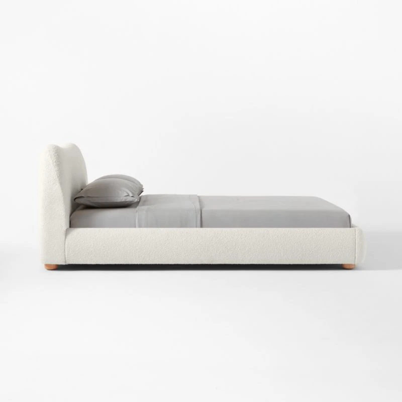 Say it with us: all-over boucle. White king bed designed by Ross Cassidy is reminiscent of 1930s Italy with its shapely curves and cloud-like presence. A subtle nod to traditional camel-back silhouettes, with a dose of Ross’s signature flair. CB2 exclusive.