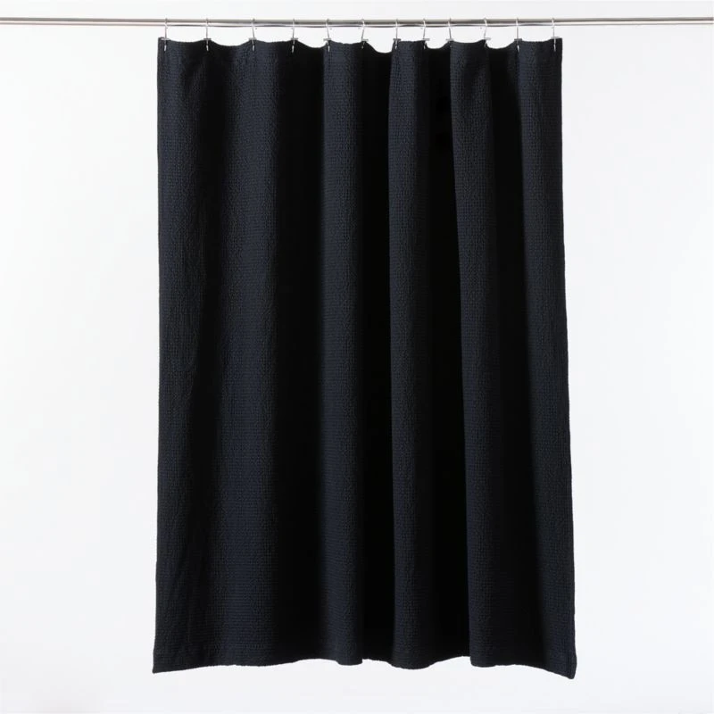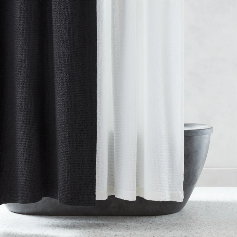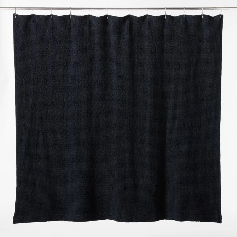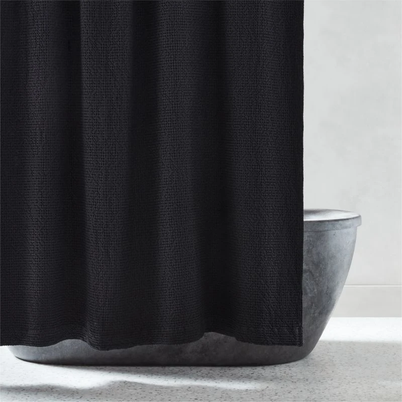 Woven of soft organic cotton with classic waffle texture, black shower curtain gives the bath a modern, spa-inspired update. CB2 exclusive.
