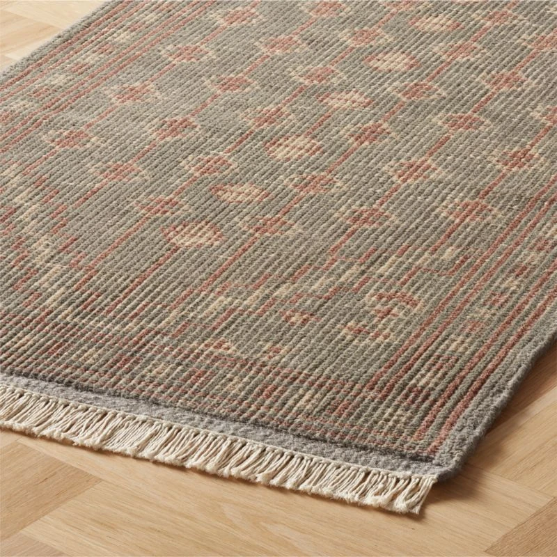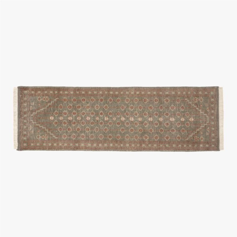 Hand-knotted in India with 18–19 knots per square inch, pure New Zealand wool is shaped into an intricately detailed design on a background of muted grey/green with pops of earthy, neutral shades. Distressed by hand for a vintage appeal, each runner has its own unique variations in tone. Flat weave design is exceptionally good for high-traffic areas.