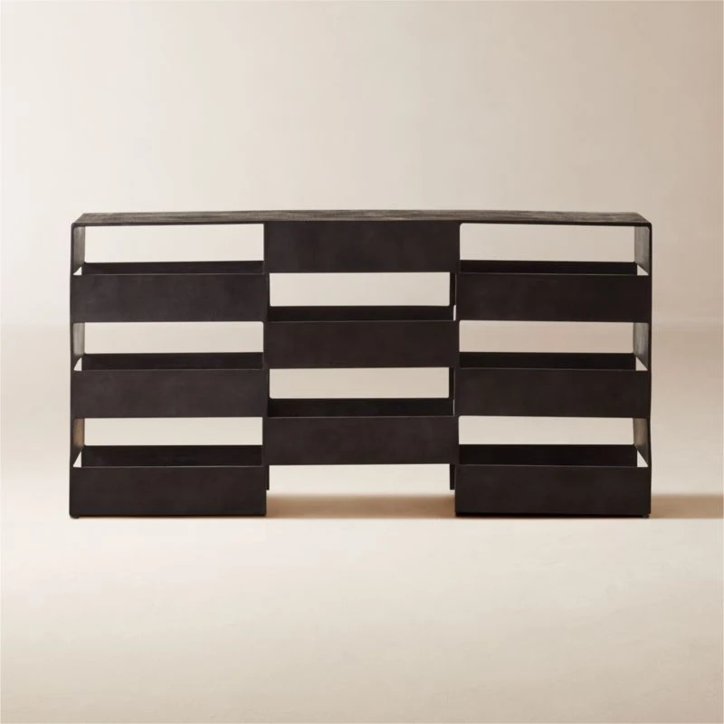 Made from cast aluminum and designed to look like a rigid, stacked checkerboard, console table by architect-designer Jerome Byron appears paper-thin and lightweight. Inspired by the louvered windows and shutters found on homes in the Grenadines and finished with a matte black powder coat, this hand-poured console table is the perfect indoor-outdoor accent piece. CB2 exclusive.