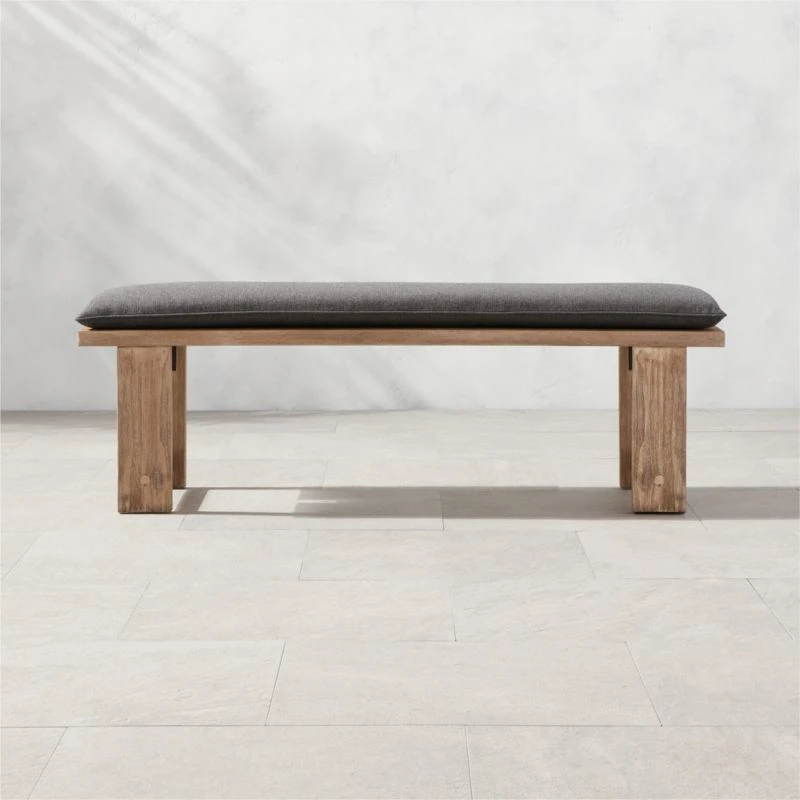 Designed by California studio Lawson-Fenning, dining bench’s minimalist silhouette is enhanced by a weathered aesthetic. Gray-toned FSC ®-certified teak wood is wire-brushed, while cushion is covered in Sunbrella performance fabric in a complementary charcoal color and attaches with ties. CB2 exclusive.
