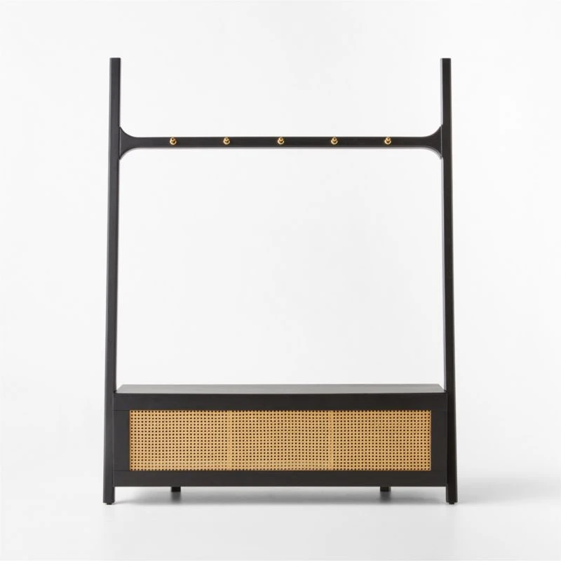 From Melbourne-based design studio VUUE, modern hall tree brings high design to entryway storage. Mahogany certified sustainable by the Forest Stewardship Council ® is finished in a dark black stain that still allows the grain to show through. Hidden drawer adds a stunning pop of natural cane that contrasts beautifully with the sleek black mahogany. Solid brass hooks hang from a bar at the top to support coats, scarves and hats. CB2 exclusive.