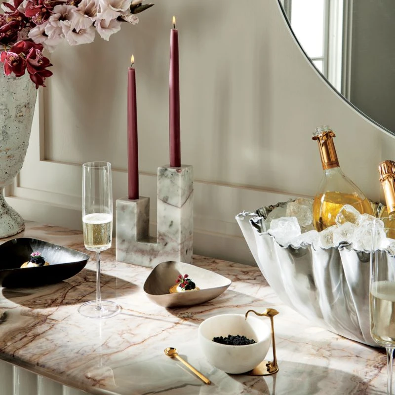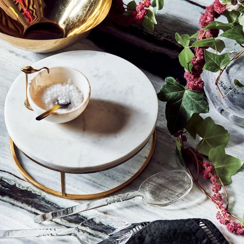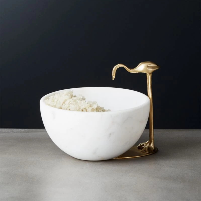 Meet Miles. The long-legged brass bird stands tall over hand carved white marble bowl. Beautifully finished with just the right amount of quirk. Perfect for snacks and show. CB2 exclusive.