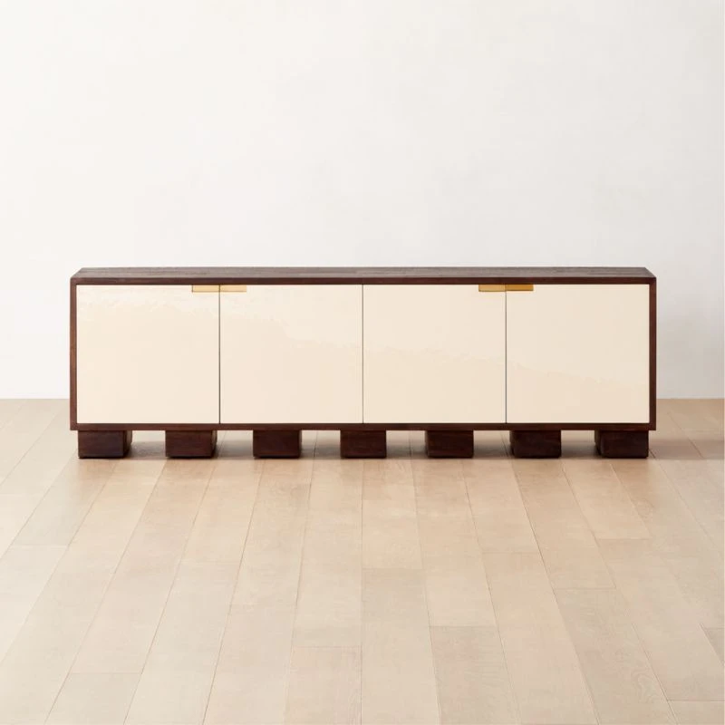 Inspired by Brutalist architecture, media cabinet by Barcelona design house Mermelada Estudio has minimalist construction details and chunky, repetitive block legs. Creamy, high-gloss enamel doors are adorned with a soft, subtle waviness that beautifully reflects light and contrasts with the chocolate-stained, wire-brushed mango wood case. Integrated cutout handles, crafted from unlacquered brass, will develop a unique patina that will vary in color and darken over time. CB2 exclusive.