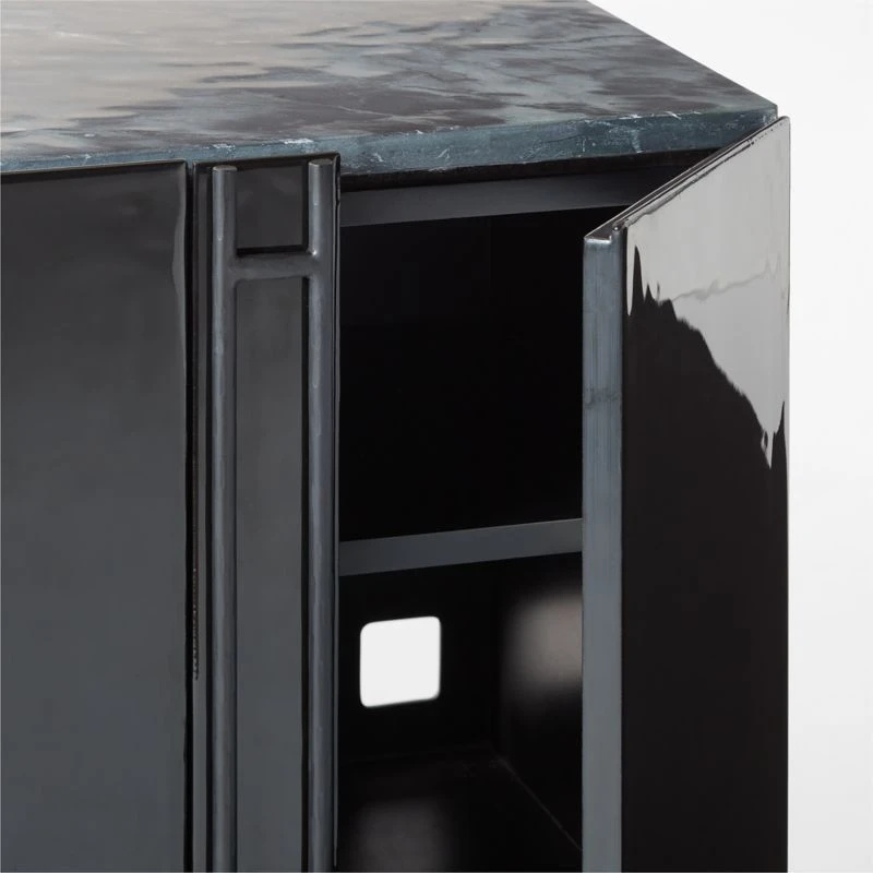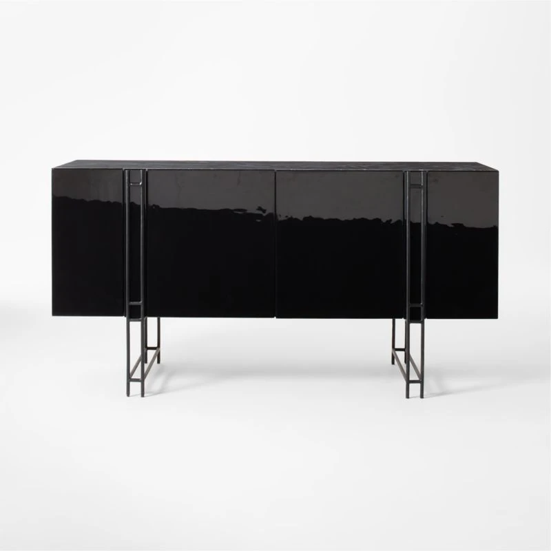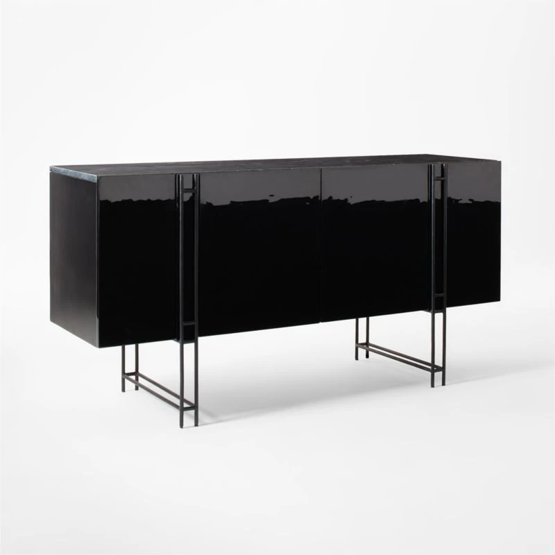 In a nod to postmodern design, credenza by VUUE has bold form and standout details. The lacquered case beautifully tucks media essentials behind high-gloss black enamel doors, while a polished black fantasy marble top adds more luxurious shine. Matte black solid iron rod legs, replete with hammered texture, add architectural appeal. CB2 exclusive.