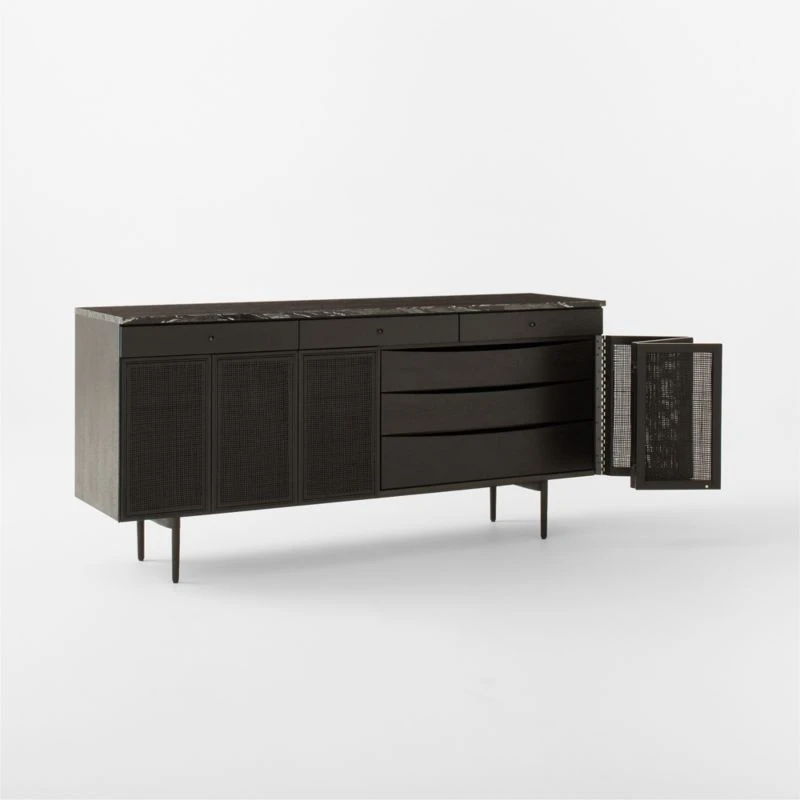 Originally manufactured in dark wood, the New England console is updated in painted black oak veneer, a polished Black Serpeggiante Marble top and black nickel hardware, but otherwise remains true to Paul McCobb’s design. Solid oak doors with cane fronts feature piano hinges that open to reveal six additional drawers, providing an abundance of storage for the living room, dining room or bedroom. CB2 exclusive.