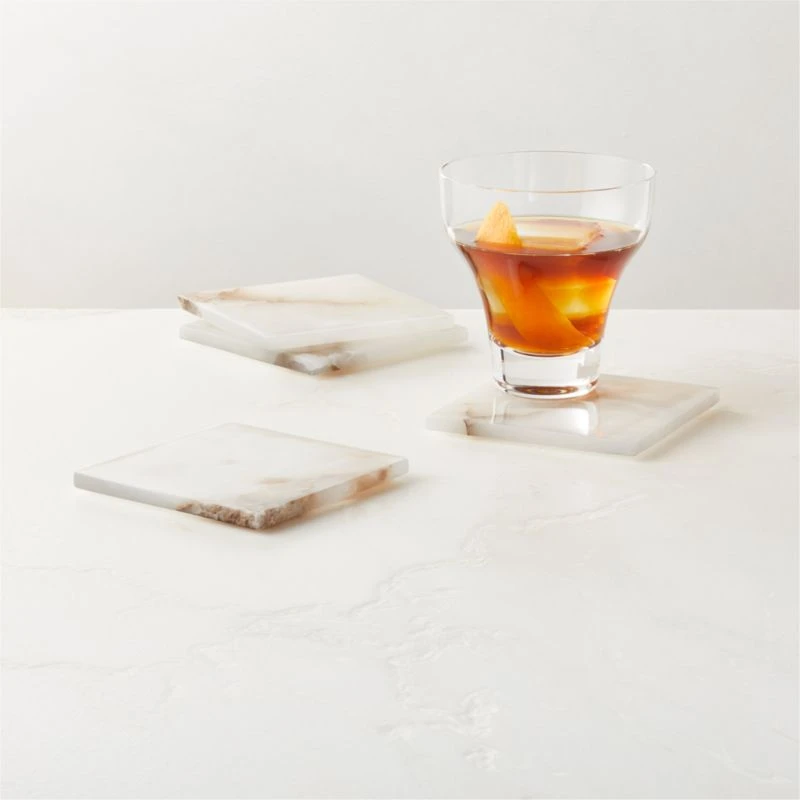 Drink time is all squared away with Oni White Alabaster Coasters. Set of four low-profile, polished stones showcasing mainly white with touches of brown. Each square coaster will be unique as natural patterns and colors vary. CB2 exclusive.