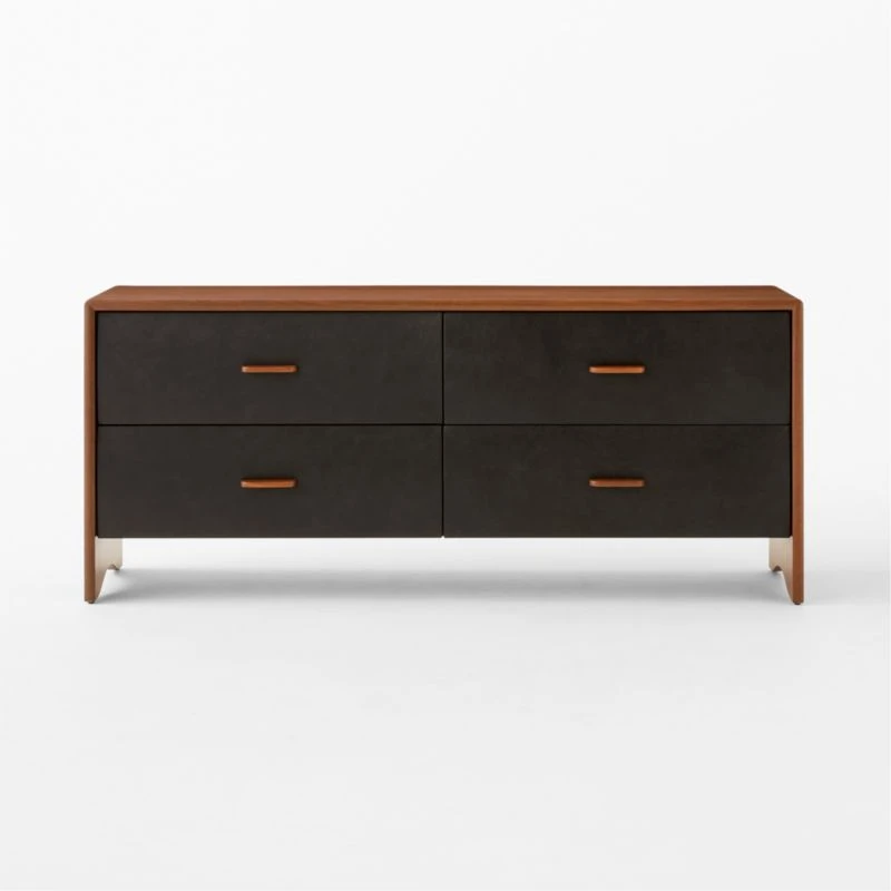 The beauty of simple, natural materials is apparent in Jannis Ellenberger’s low dresser. Its leather drawer fronts will wear beautifully over time, further enhancing the solid walnut handles and walnut frame. Four drawers gently slide along soft-close glides, giving this piece a flawless balance of form and function. CB2 exclusive.
