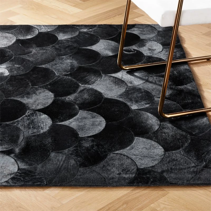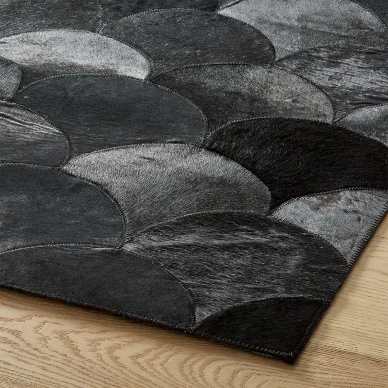 Layers of chic hair-on-hide leather scallops add a sophisticated fanfare to the floor. Rich hide creates a luxurious foundation for any living space. Due to the nature of hide, rugs range from brown-black to true black. CB2 exclusive.