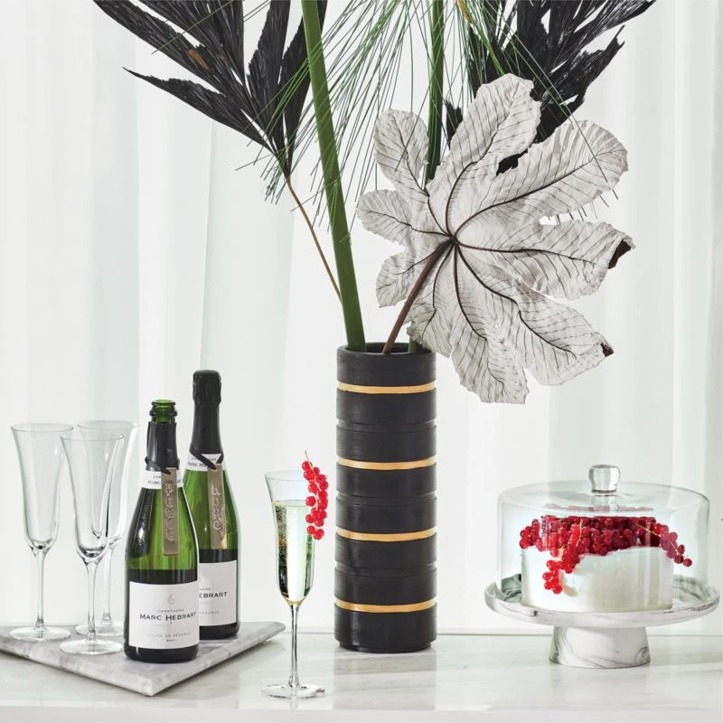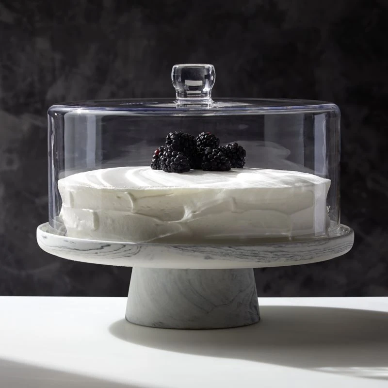 Raw porcelain mixed with color clay swirls to create a black and white cake stand base inspired by designer Jennifer Fisher’s favorite salad bowl at home. The end result is a unique marbleized effect that feels special and sophisticated but works for everyday. “I wanted something graphic that matched the rest of the collection, but with a neutral edge,” says Jennifer Fisher. Glass lid tops the piece to clearly display baked goods and treats. CB2 exclusive.
