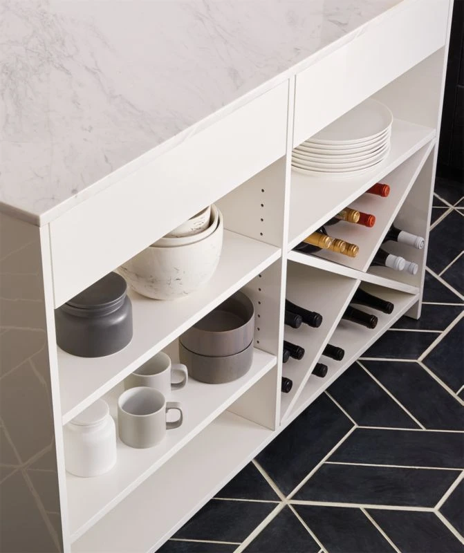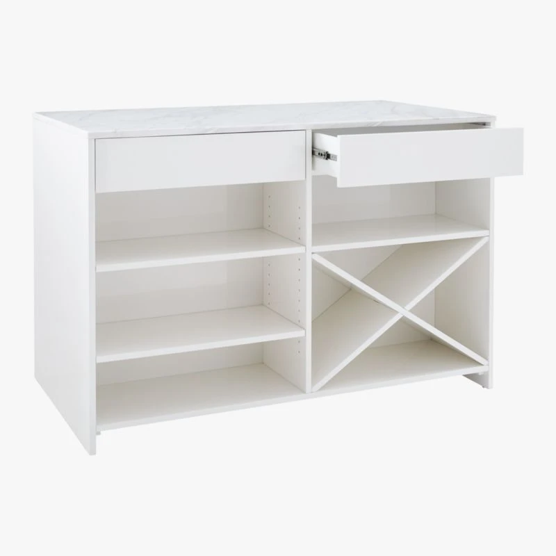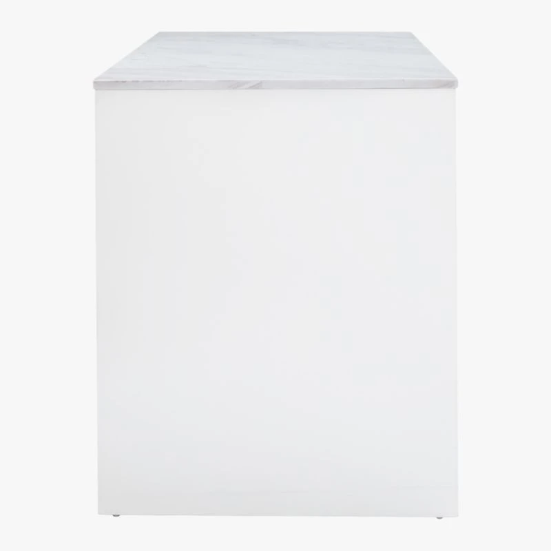 A center staple for any kitchen. Designed by Mark Daniel of Slate Design, hi-gloss white lacquered wood frame forms nooks and cubbies of all sizes for added kitchen storage. A large slab of honed white marble with grey veining tops the island, overhanging on one side for counter-height stools and chairs to pull up. Learn about Mark Daniel on our blog. CB2 exclusive.