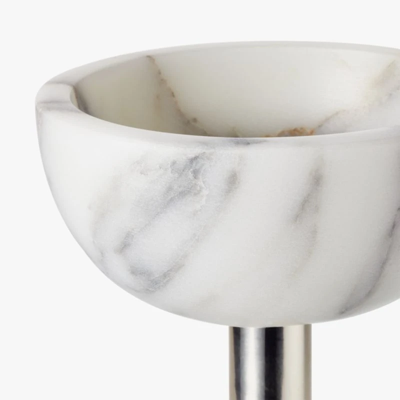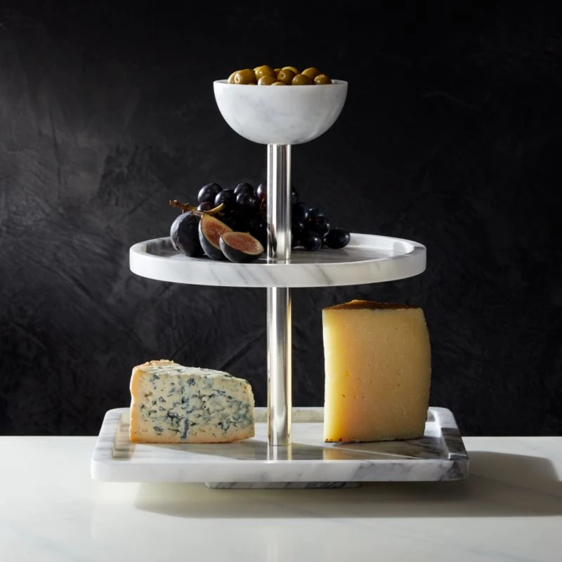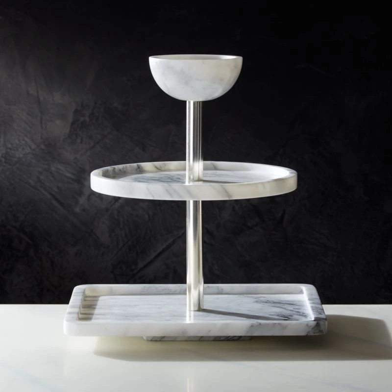 Honed white Arabascato marble is imported from Italy and hand-carved into party tower designed by Jennifer Fisher. Two tiers are topped off with a small, round serving bowl because, as Jennifer puts it, “I hate having loose nut bowls, so I added it to the top of this party tower. It’s chic and works for both casual and formal entertaining.” Beautiful, light to dark grey veining will vary in intensity from piece to piece. CB2 exclusive.